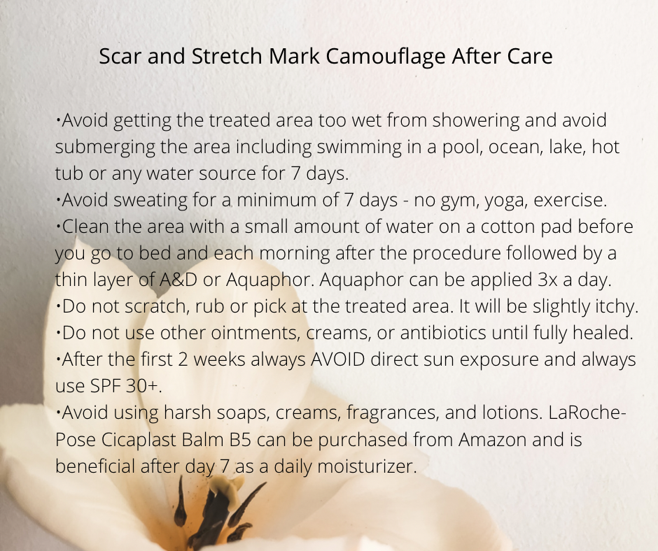 It is important that your skin is at its natural color when having scars or stretch marks camouflaged. Abstain from spray tan or sun tan 3 weeks prior. The pigments will be matched to your skin tone and will not change color and tan with the rest of your skin, therefore it is important to always apply spf.